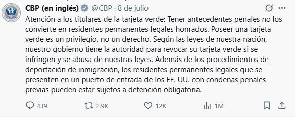 A través de un mensaje publicado el pasado 8 de julio en la cuenta oficial de CBP en la red social X (antes Twitter), Kusser subrayó que “tener una tarjeta verde es un privilegio, no un derecho” y que cualquier abuso o infracción a las leyes estadounidenses puede activar procedimientos de deportación.
