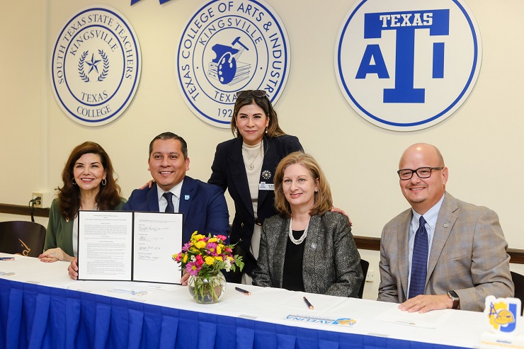 El acuerdo fue suscrito por el presidente de TAMUK, Dr. Robert Vela, la presidenta de Laredo College, Dra. Minita Ramírez, así como los presidentes de Coastal Bend College y Victoria College, durante una ceremonia en el Founder’s Room de la universidad en Kingsville.