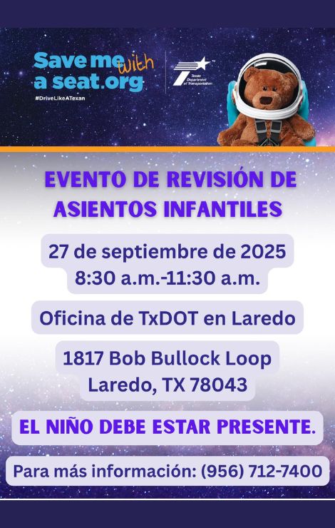 Como parte de la campaña, TxDOT anunció que el sábado 27 de septiembre se realizará una jornada de inspecciones gratuitas de asientos infantiles en las oficinas locales del departamento en Laredo. Técnicos certificados revisarán los dispositivos y responderán dudas de los padres.