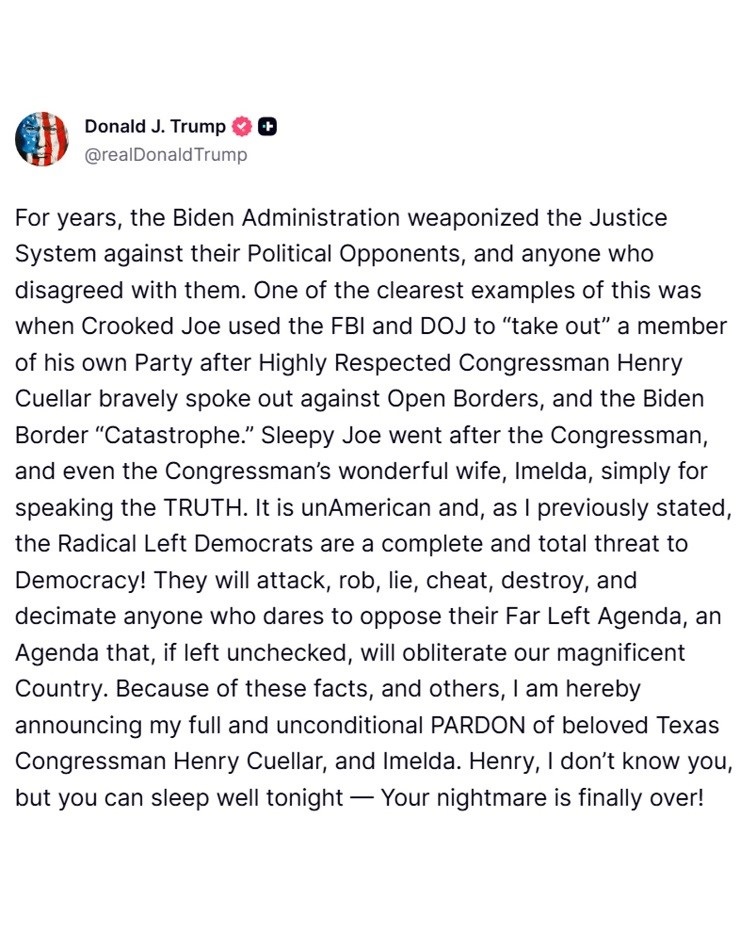 El anuncio fue realizado a través de Truth Social, donde el presidente acusó a la administración de Joe Biden de utilizar al Departamento de Justicia para perseguir a opositores políticos. Trump sostuvo que tanto Cuellar como su esposa, Imelda, fueron investigados injustamente.