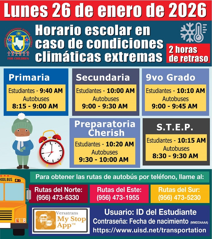 LAREDO, TX. El United Independent School District informó que este lunes 26 de enero operará con un inicio de clases retrasado dos horas, como medida preventiva ante las condiciones de frío extremo previstas en el condado de Webb.